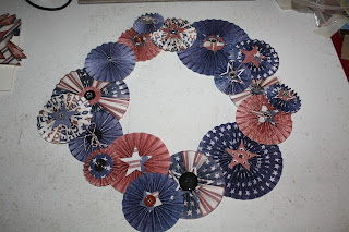 Last but not least............my favorite project, because it was the MOST FUN to make! The rosette wreath. (cue trumpets daah da da daaaaaah!) I got the idea from Pinterest and then checked out videos on YouTube for how to make the best rosettes. I had made a couple in my Stampin' Up hostess class last year about this time. I loved them so much that I kept them in the forefront of my mind this WHOLE time looking for a project where I could use a bunch of them all at once. Someone pinned this adorable wreath in spring colors for Easter over the summer and an idea was born. I was going to do a Fall wreath for my mother-in-law's birthday, which is coming up this Thursday. A hem (cue sheepish look). I don't think I have the energy to do it now after all the crafting I've done the past couple of weeks. I am a middle school science teacher, and 9 weeks' exams are coming up so my focus needs to shift back to non-craft related topics for the next week or so. Who knows? I might come in from work tomorrow evening bright-eyed and bushy-tailed looking for some paper to score and fan-fold. Stranger things have happened. LOL! Anyway, I used the same gorgeous patriotic paper that I have used throughout. By the way, I don't think that I mentioned that the patriotic paper I've been using is from The Paper Studio, which is probably my favorite line of scrapbook paper in the entire world. No, I haven't seen ALL the paper in the ENTIRE world, but I think that if I had, I would still love The Paper Studio's paper best. I'm never disappointed in the quality of the end product when I use their paper. Running a close second (a very close second) is Stampin' Up paper. The colors are so pure and I love how their scrapbook designer paper matches with their inks/markers/plain paper colors/ribbon/embellishments. You can't go wrong with either brand. I've lost my train of thought...........oh, yeah! The rosette wreath! Isn't it pretty? I'm just in love with it! It looks really good with those barn stars, too, doesn't it.